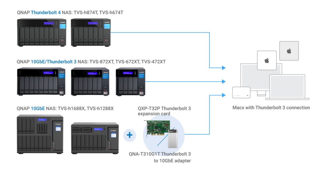 Các mẫu NAS QNAP đi kèm cổng Thunderbolt™ , 25GbE, 10GbE, 2.5GbE hoặc USB 4.
