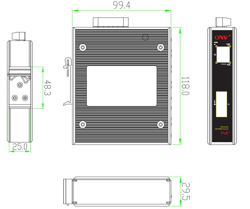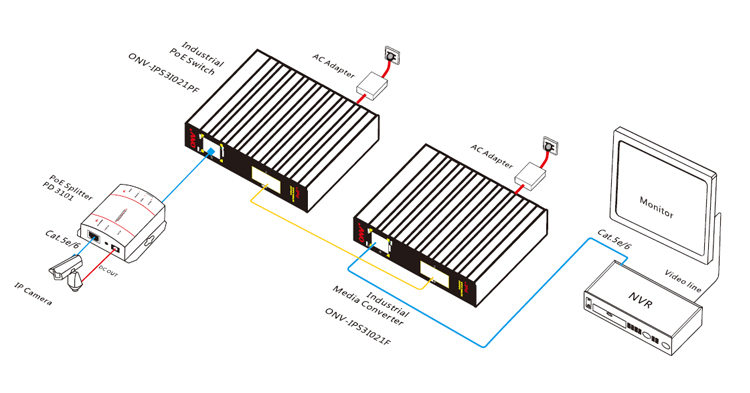 The ONV-IPS31021PF series is a 10/100M industrial PoE fiber switch independently developed by ONV. It has 1*10/100M PoE port and 1*155M SC slot port, Port 1 can support IEEE 802.3af/at PoE standard,single port PoE power up to 30W, the maximum PoE output power is 18W (at-36W). As a PoE power supply device, it can automatically detect and recognize the power receiving equipment that meets the standard and supply power through the network cable. It can supply power to POE terminal equipment such as wireless AP, web camera, VoIP phone, industrial sensor through network cable, and meet the network environment that needs high-density PoE power supply. It is suitable for intelligent transportation, rail transit, electric power, mining, metallurgy and green energy. Industrial scenes such as construction set up a cost-effective and stable communication network.