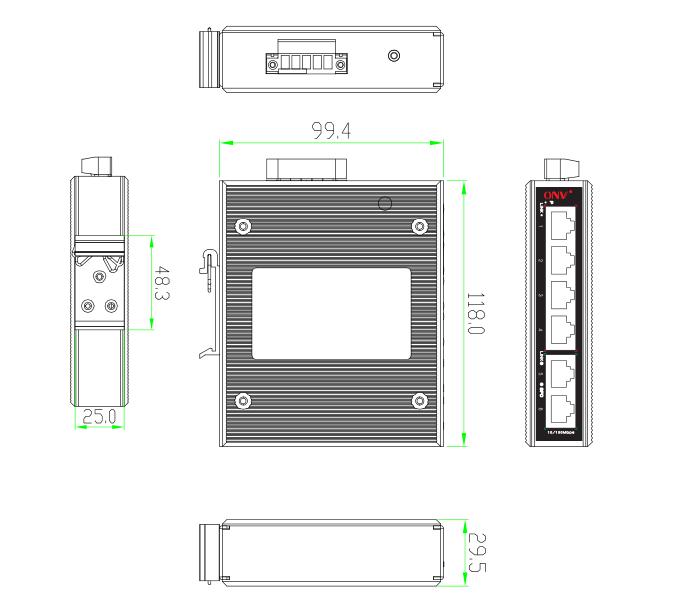 The ONV-IPS31064 is a 10/100M industrial Ethernet switch independently developed by ONV. It is designed to meet industrial fields and systems and can operate stably for a long time in harsh environments. It has 6*10/100/1000M RJ45 ports. Each port can support full line-rate forwarding.