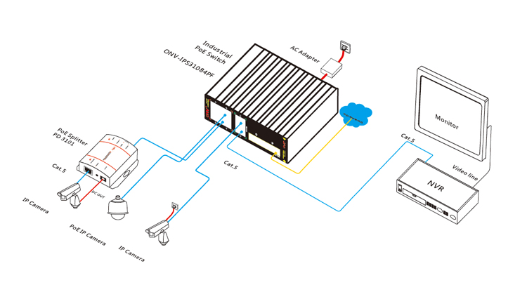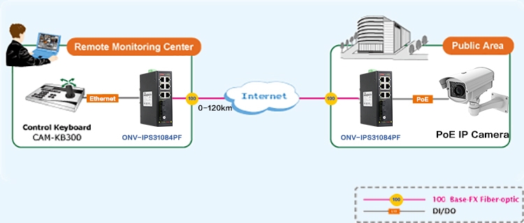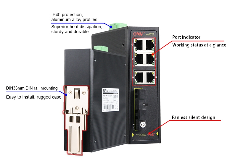 The ONV-IPS31084PF series is a 10/100M industrial PoE fiber switch independently developed by ONV. It has 6*10/100M RJ45 ports and 2*155M SC slot port, Port 1-4 can support IEEE 802.3af/at standard PoE power supply, and single port PoE power reaches 30W. The maximum PoE output power is 60W(at-120W). As a PoE power supply device, it can automatically detect and recognize the power receiving equipment that meets the standard and supply power through the network cable. It can supply power to POE terminal equipment such as wireless AP, web camera, VoIP phone, industrial sensor through network cable, and meet the network environment that needs high-density PoE power supply. It is suitable for intelligent transportation, rail transit, electric power, mining, metallurgy and green energy. Industrial scenes such as construction set up a cost-effective and stable communication network.
