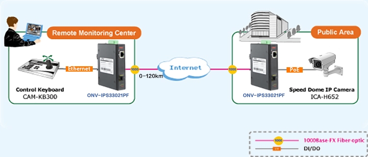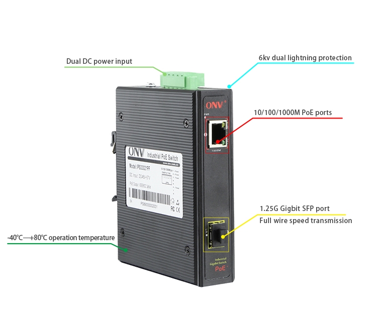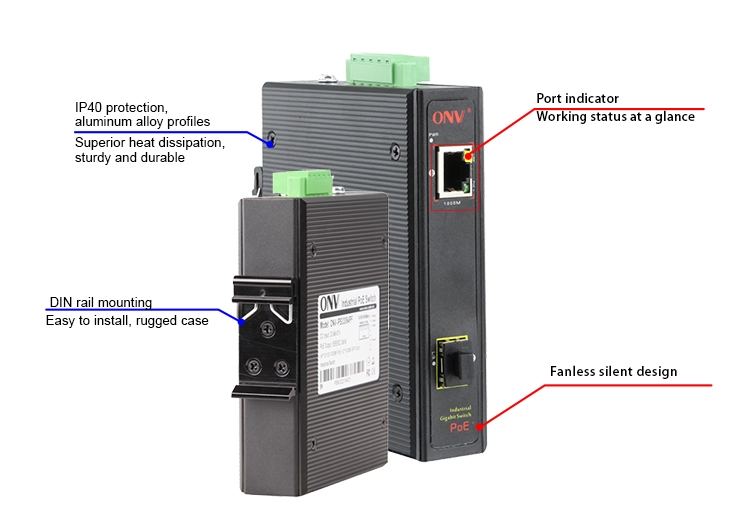 ONV-IPS33021PF series is a full gigabit industrial POE switch independent development by ONV. It has 1*10/100/1000M RJ45 port and 1*1000M SFP port, Port 1 can support IEEE 802.3af/at standard PoE power supply. the maximum PoE output power is less than 18W(at-36W). As a PoE power supply device, it can automatically detect and recognize the power receiving equipment that meets the standard and supply power through the network cable. It can supply power to POE terminal equipment such as wireless AP, web camera, VoIP phone, industrial sensor through network cable, and meet the network environment that needs high-density PoE power supply. It is suitable for intelligent transportation, rail transit, electric power, mining, metallurgy and green energy. Industrial scenes such as construction set up a cost-effective and stable communication network.