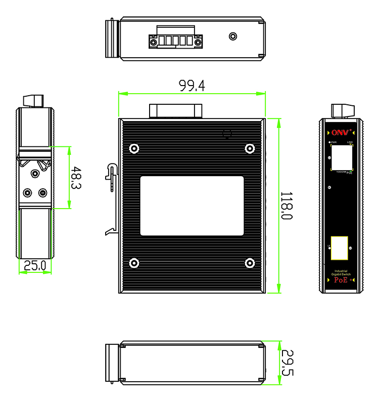 ONV-IPS33021PF | Unmanaged industrial PoE fiber switch with 1*10/100/1000M RJ45 port and 1*1000M uplink SFP slot port, Port 1 can support IEEE802.3af/at PoE. Support dual DC power supply input and DIN rail mounting. | <18W |