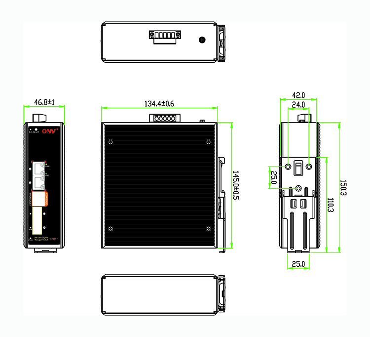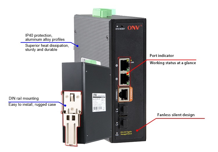 ONV-IPS33042PFM is a full gigabit managed industrial PoE switch independently developed by ONV. it has 2*10/100/1000M PoE ports and 2*100/1000M SFP fiber slot ports , port 1-2 can supports IEEE 802.3af/at standard POE power supply, single port POE power up to 30W, and the maximum POE output power is 36W (at-60W). As a POE power supply device, it can automatically detect and identify the electrical equipment that meets the standard and supply power through the cable. It can supply the POE terminal equipment, such as wireless AP, network camera, network telephone, industrial sensor and so on, to meet the demand for high density PoE power supply network environment. It is suitable for intelligent transportation, rail transportation, electric power industry, mining mining, metallurgy and green energy construction and so on. A reliable communication network.