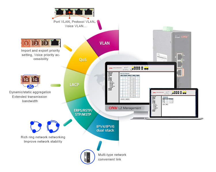 The ONV-IPS33042PFM has the L2+ full network management function, support IPV4/IPV6 management, static route full line rate forwarding, security protection mechanism, ACL/QoS policy and VLAN, and is easy to manage and maintain. Support multiple network redundancy protocols STP/RSTP/MSTP (<50ms) and (ITU-T G.8032) ERPS(<20ms) to improve link backup and network reliability. When one-way network fails, communication can be quickly restored to ensure important Uninterrupted communication for applications. According to the actual application requirements, you can configure multiple application services such as PoE power management, port traffic control, VLAN division, and SNMP through the Web network management mode.