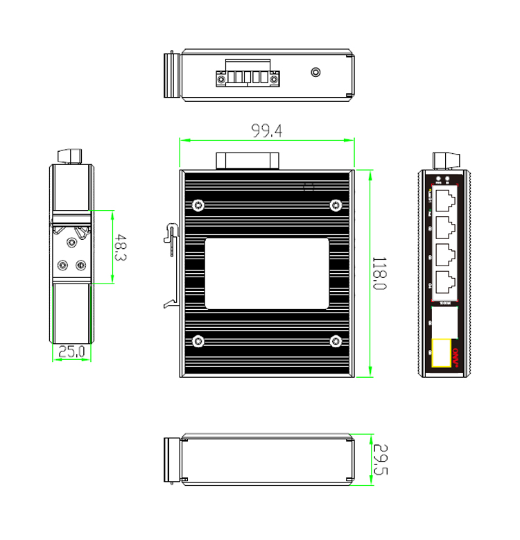 Fixed Port | 4*10/100/1000Base-T PoE ports (Data/Power) 1*10/100/1000Base-T uplink RJ45 port (Data) 1*1000Base-X uplink SFP fiber slot port (Data) 2 sets of V+, V- redundant DC power port (5P Phoenix terminal) | |