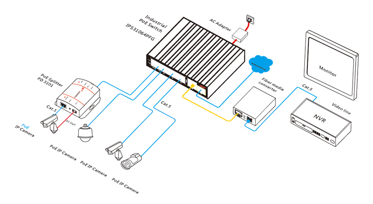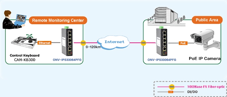 The ONV-IPS33064PFG series is a full gigabit industrial PoE fiber switch independently developed by ONV. It has 5*10/100/1000Base-T RJ45 ports and 1*1000Base-X uplink SFP slot port. Port 1-4 can support IEEE 802.3af/at PoE standard, single-port PoE power up to 30W. As a PoE power supply device, it can automatically detect and recognize the power receiving equipment that meets the standard and supply power through the network cable. It can supply power to PoE terminal device such as wireless AP, IP camera,industrial sensor through the network cable, and meet the network environment that needs high-density PoE power supply. It is suitable for intelligent transportation, rail transit, power industry, mining, petroleum, sea transportation. Industrial scenes such as metallurgy and green energy construction form a cost-effective, stable and reliable communication network.