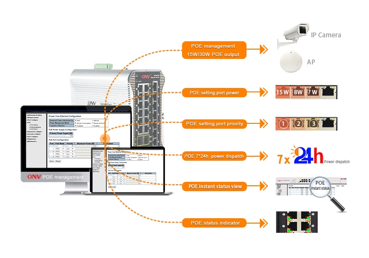 The ONV-IPS33248PFM-4GF is a full gigabit L2+ managed industrial PoE fiber switch independently developed by ONV. it has 20*10/100/1000Base-T RJ45 ports and 4*100/1000Base-X SFP fiber slot ports. Port 1-8 can support IEEE 802.3af/at standard POE, single port POE power up to 30W, and the maximum POE output power of the whole machine is 120W(at-240W). As a PoE power supply device, it can automatically detect and recognize the power receiving equipment that meets the standard and supply power through the network cable. It can supply power to POE terminal equipment such as wireless AP, web camera, VoIP phone, industrial sensor through network cable, and meet the network environment that needs high-density PoE power supply. It is suitable for intelligent transportation, rail transit, electric power, mining, metallurgy and green energy. Industrial scenes such as construction set up a cost-effective and stable communication network.