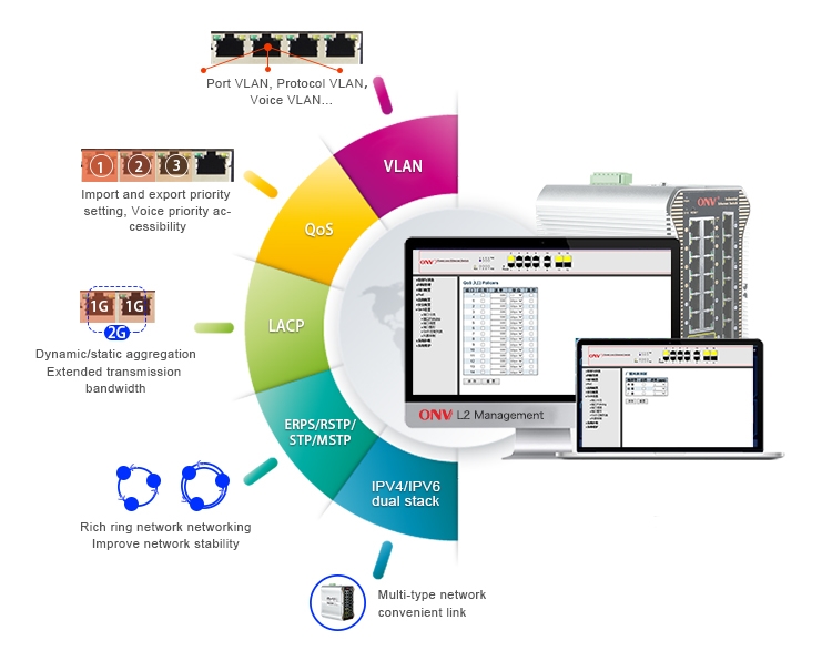 The ONV-IPS33248PFM-4GF has L2+ full network management function, supports IPV4/IPV6 management, supports static route full line rate forwarding, supports complete security protection mechanism, complete ACL/QoS policy and rich VLAN functions, and is easy to manage and maintain. Supports multiple network redundancy protocols STP/RSTP/MSTP (<50ms) and (ITU-T G.8032) ERPS (<20ms) to improve link backup and network reliability. When one-way network fails, communication can be quickly restored to ensure important Uninterrupted communication for applications. According to the actual application requirements, you can configure multiple application services such as PoE power management, port traffic control, VLAN division, and SNMP through the Web network management mode.
