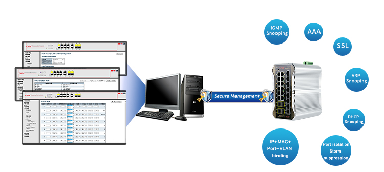 Security | IP-MAC-VLAN-Port binding ARP inspection,Anti-DoS attack AAA & RADIUS,MAC learning limit Mac black holes,IP source protection IEEE802.1X & MAC address authentication Broadcast storm control,Backup for host datum SSH 2.0,SSL,Port isolation,ARP message speed limit User hierarchical management and password protection | |