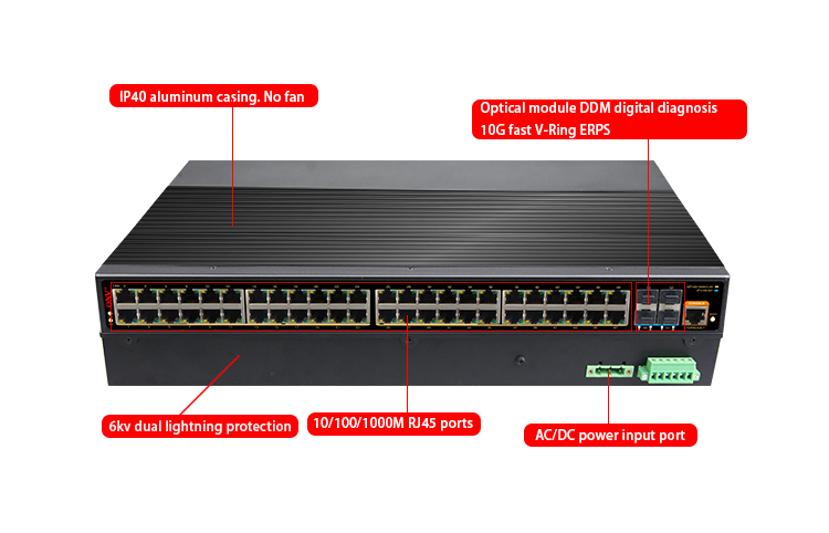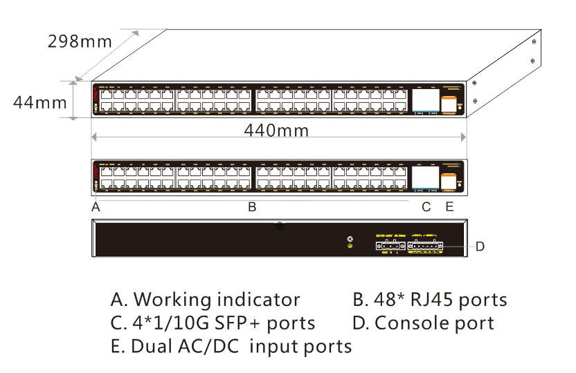 Fixed Port | 48*10/100/1000Base-T RJ45 ports (Data) 4*1/10G uplink SFP+ slot ports (Data) 1 * console port(115200,N,8,1) Alarm switch(FAULT) 1 *AC100-240V power input port 2 * DC12-48V power input ports ( support anti-reverse protection) |