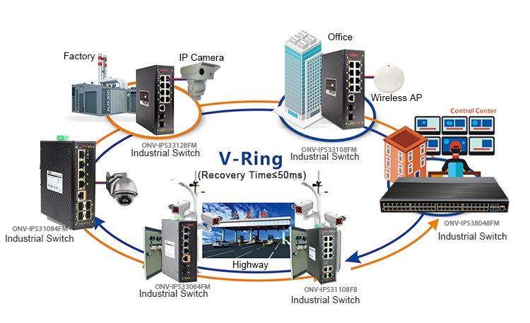 The ONV-IPS38048FM has L3 full network management function, supports IPV4/IPV6 management, supports static route full line rate forwarding, supports complete security protection mechanism, complete ACL/QoS policy and rich VLAN functions, and is easy to manage and maintain. Supports multiple network redundancy protocols STP/RSTP/MSTP (<50ms) and (ITU-T G.8032) ERPS (<20ms) to improve link backup and network reliability. When one-way network fails, communication can be quickly restored to ensure important Uninterrupted communication for applications. According to the actual application requirements, you can configure multiple application services such as port traffic control, VLAN division, and SNMP through the Web network management mode. It meets the needs of various industrial Ethernet application environments and is suitable for industrial, intelligent transportation, rail transit, power industry, mining, petroleum, marine, metallurgical and green energy construction to form a cost-effective, stable and reliable communication network.