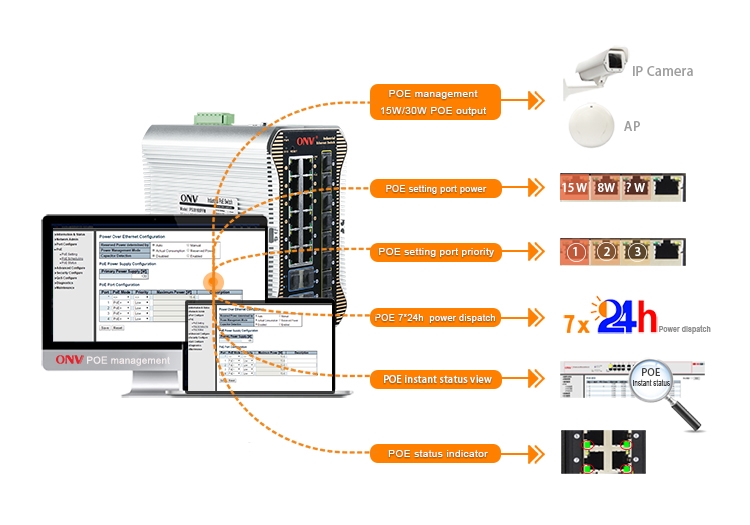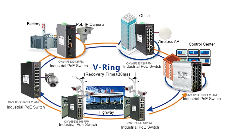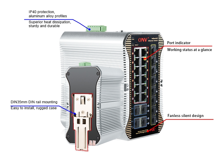 The ONV-IPS38248PFM has the L3 full network management, supports IPV4/IPV6 management, static route full line rate forwarding, security protection mechanism, ACL/QoS policy and VLAN, and is easy to manage and maintain. It has the leading ring network technology, supporting a variety of industrial redundant redundant ring network protocol, any port can be a ring, support chain type, star type, double star type, ring type, tangent ring, intersecting ring, coupling ring, ring network 20ms self healing. It has high reliability, security and manageability, ensure reliable transmission of key data, support remote management, and can manage cluster management with ONV-NMS network management platform. ONV-IPS38248PFM industrial series products fully follow industrial product design and material. The casing uses aluminum alloy to enhance heat dissipation. It has excellent industrial field environment adaptability (including mechanical stability, climate and environment adaptability, electromagnetic environment adaptability, etc.), Protection level is IP40, support dual power supply, low power consumption no fan heat dissipation technology, MTBF average fault free working time can reach 35 years, 5 years warranty.