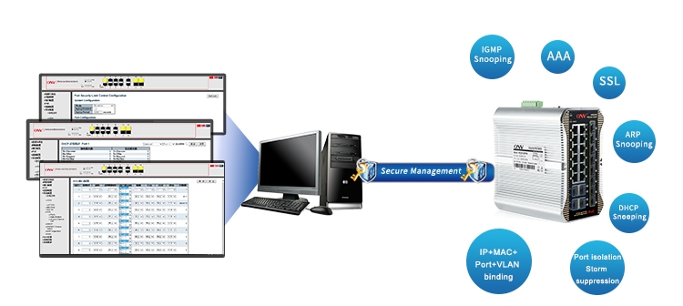 Security | IP-MAC-VLAN-Port binding ARP inspection,Anti-DoS attack AAA & RADIUS,MAC learning limit Mac black holes,IP source protection IEEE802.1X & MAC address authentication Broadcast storm control,Backup for host datum SSH 2.0,SSL,Port isolation,ARP message speed limit User hierarchical management and password protection | |