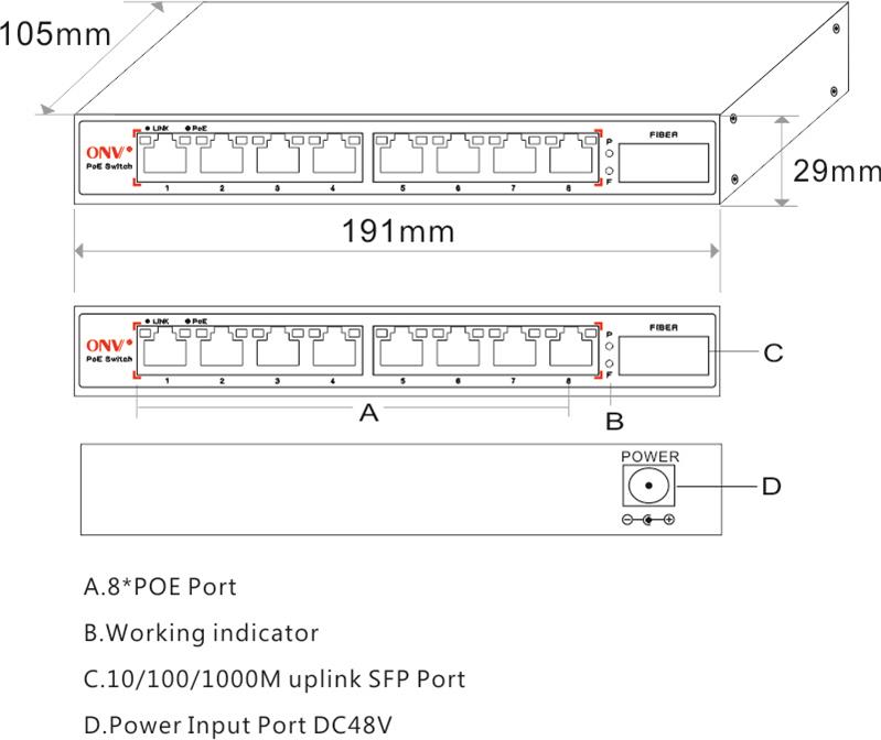 The ONV-POE31008PF is a 10/100M unmanaged PoE fiber switch independently developed by ONV. It has 8*10/100M RJ45 ports and 1*155M SC slot port. Port 1-8 can support IEEE 802.3af/at PoE standard, single port PoE power up to 30W, the maximum PoE output power is 110W. As a PoE power supply device, it can automatically detect and recognize the power receiving equipment that meets the standard and supply power through the network cable. it can automatically detect and identify the the electrical equipment that meets the standard and supply power to it through the network cable, devices including wireless AP, IP camera, IP telephone and other PoE terminal equipment etc. In addition, it is suitable for networking system of hotel, campus, dormitory and small&medium enterprise etc.