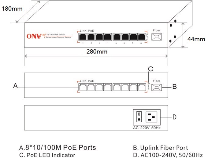 | ONV-POE31008PFN-at | Unmanaged PoE fiber switch with 8*10/100M PoE ports and 1*155M SC uplink port. Port 1-8 can support IEEE802.3af/at PoE standard. By default, the SC port 1310nm/20km single mode dual fiber module is configured. External 250W power supply. Support 1U/19-inch cabinet installation. |