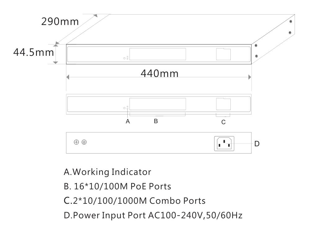 Fixed Port | 16*10/100Base-TX PoE ports (Data/Power) 2*10/100/1000M uplink RJ45 ports (Data) 2*1000M uplink SFP slot ports (combo port) | |