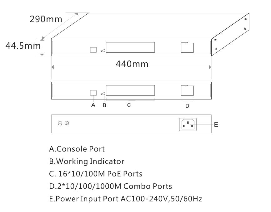 Fixed Port | 16*10/100Base-TX PoE ports (Data/Power) 2*10/100/1000Base-T uplink RJ45 ports (Data) 2*1000M uplink SFP fiber slot ports (Data)(Combo port) 1*Console port (command line ) 1*Console RS232 port | |
