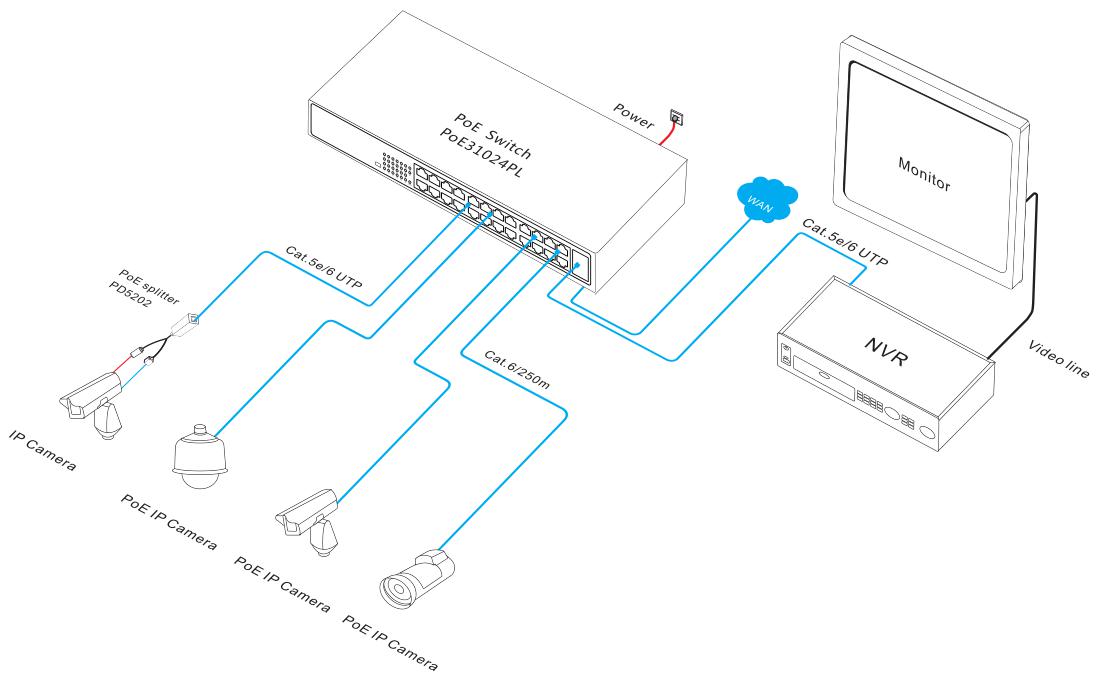 ONV-POE31024PL | Unmanaged PoE switch with 24*10/100M PoE ports and 2*10/100/1000M uplink RJ45 ports, Port 1–24 can support IEEE802.3af/at PoE standard, Port 17-24 can support 10M/250 meters transmission. Built-in 250W power supply, Support 1U/19 inch cabinet installation. |