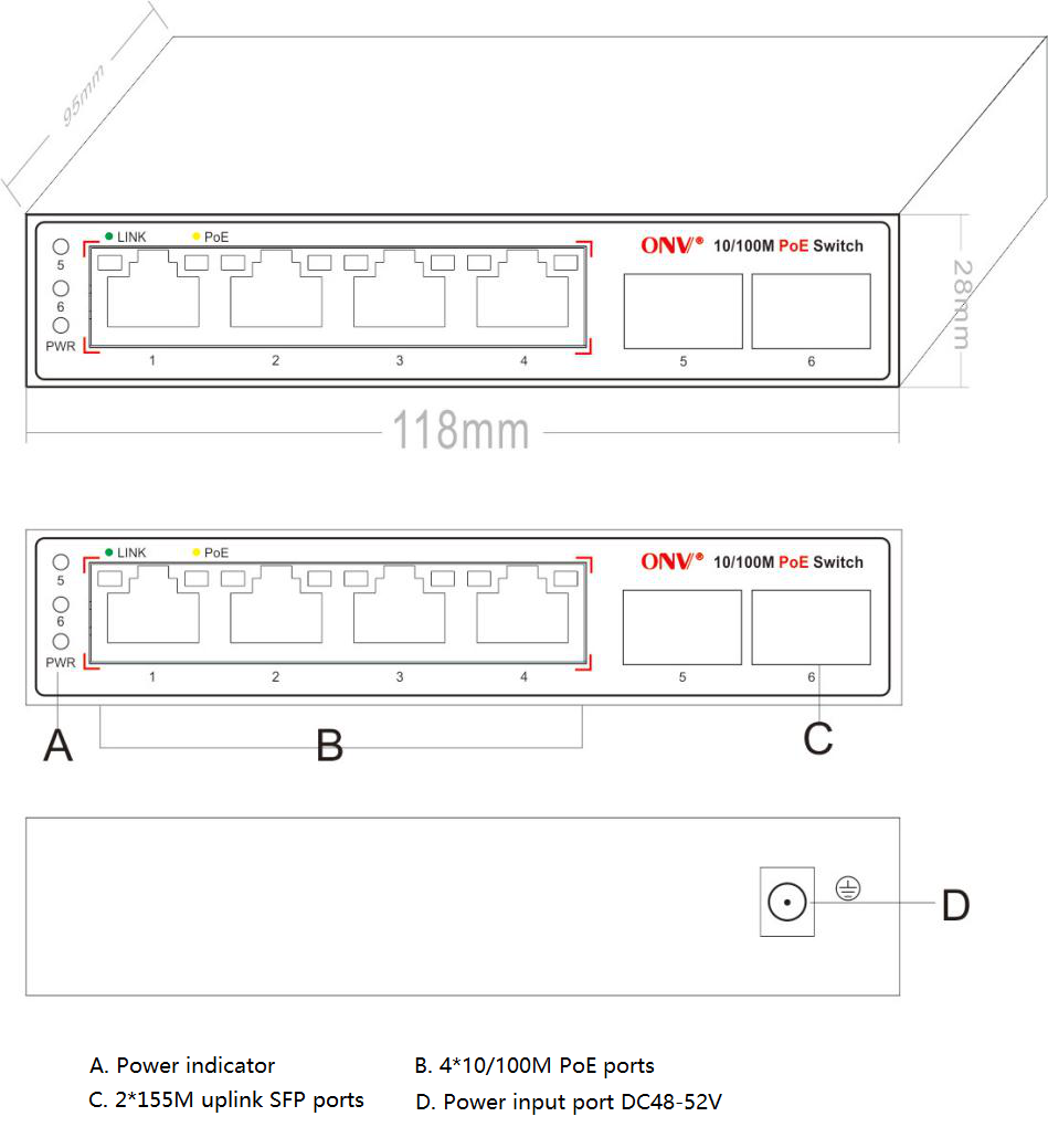 | LED Indicator | Power: PWR (green), network: Link (yellow), PoE: PoE (green), fiber port : 5/6 (green) | |