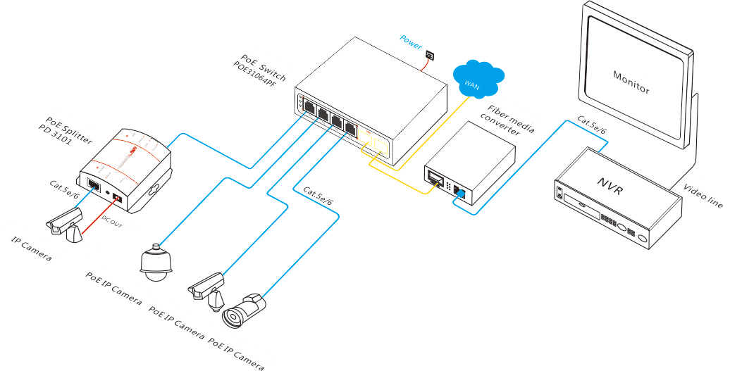 The ONV-POE31064PF is a 10/100M unmanaged PoE fiber switch independently developed by ONV. It has 4*10/100M RJ45 ports and 2*155M SFP slot ports. Port 1-4 can support IEEE802.3af/at PoE standard, single port PoE power up to 30W, the maximum PoE output power is 65W . As a PoE power supply device, it can automatically detect and recognize the power receiving equipment that meets the standard and supply power through the network cable. it can automatically detect and identify the the electrical equipment that meets the standard and supply power to it through the network cable, devices including wireless AP, Webcam, IP telephone and other PoE terminal equipment etc. In addition, it is suitable for networking system of hotel, campus, dormitory and small&medium enterprise etc.
