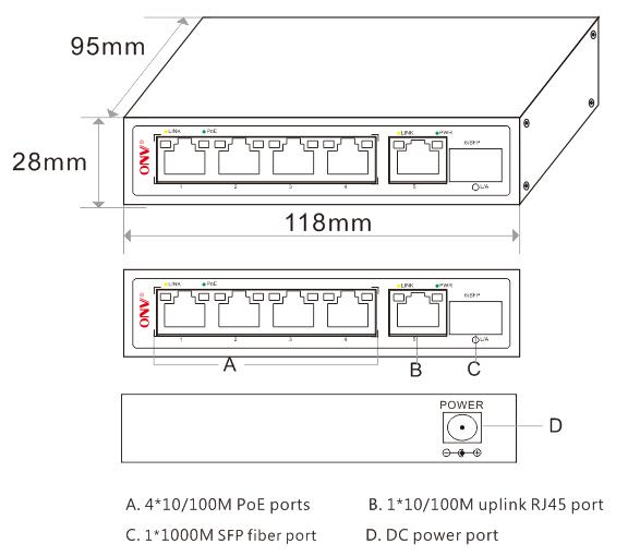 | Fixed Port | 4*10/100Base-TX PoE ports (Data/Power) 1*10/100/1000Base-T uplink RJ45 port (Data) 1*1000Base-X uplink SFP slot port (Data) | |
