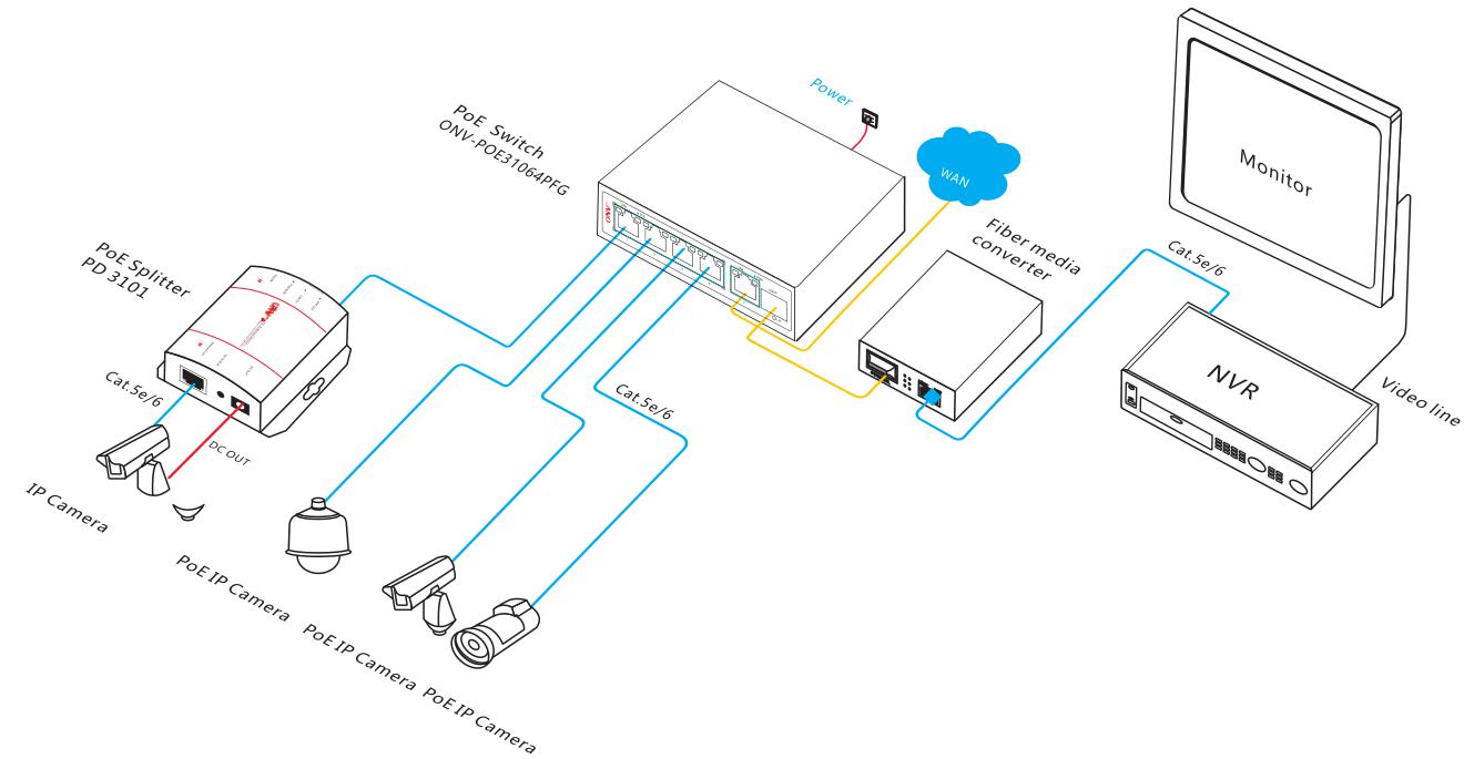 The ONV-POE31064PFG is an unmanaged PoE fiber switch independently developed by ONV. It has 4*10/100Base-TX PoE ports and 1*10/100/1000Base-T RJ45 port and1*1000Base-X SFP slot port . Port 1-4 can support IEEE802.3af/at standard PoE power supply.single port PoE power reaches 30W, and the maximum PoE output power is 65W (at-110W). As a PoE power supply device, it can automatically detect and recognize the power receiving equipment that meets the standard and supply power through the network cable. It can supply power to POE terminal equipment such as wireless AP, webcam, VoIP, visual intelligent building intercom through network cable, and meet the network environment that needs high-density PoE power supply. It is suitable for hotel, campus, factory dormitory and small and medium-sized enterprises.