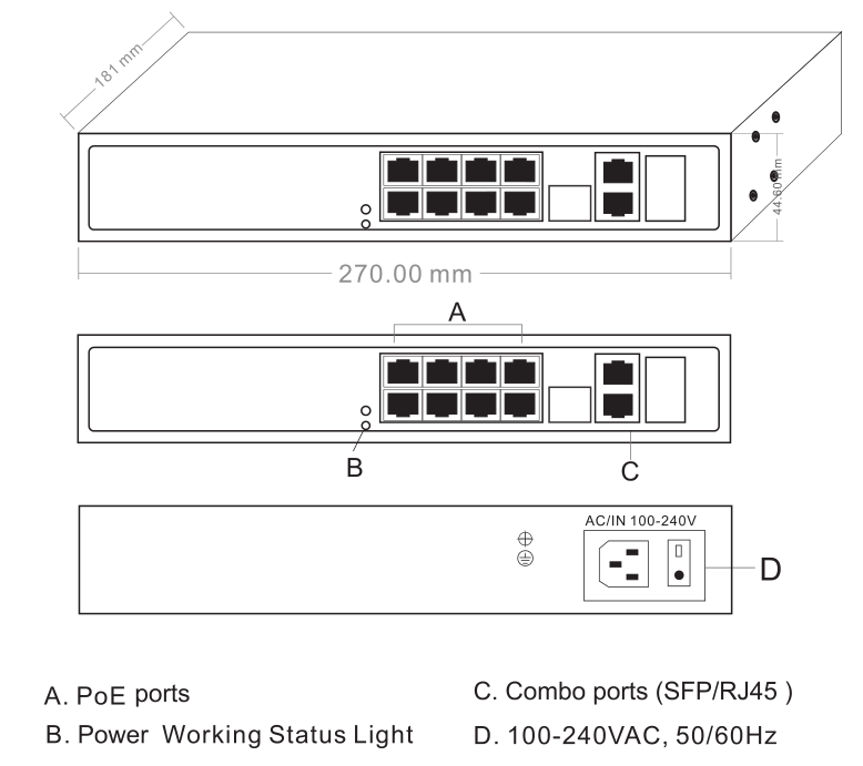 | Fixed Port | 8*10/100Base-TX PoE ports (Data/Power) 2*10/100/1000Base-T uplink RJ45 ports (Data) 2*1000M uplink SFP fiber slot ports (Data) | |