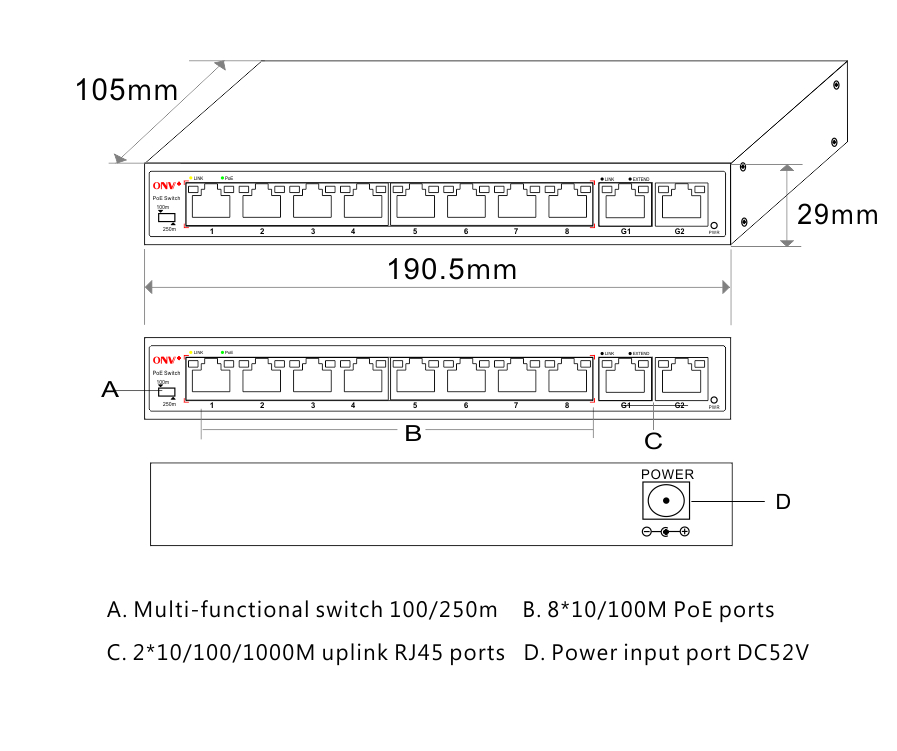 | LED Indicator | Power: PWR (green); Data: Link1 (yellow); POE: PoE (green); Function switch: EXTEND(green) | |
