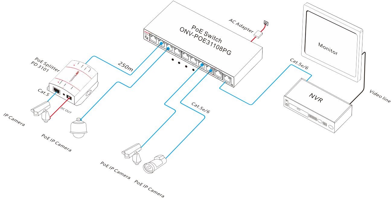 The ONV-POE31108PG is an unmanaged PoE switch independently developed by ONV. It has 8*10/100M PoE ports and 2*10/100/1000M RJ45 ports. Port 1-8 can support IEEE 802.3af/at standard PoE power supply. single port PoE power reaches 30W, and the maximum PoE output power is 110W (at-250W). As a PoE power supply device, it can automatically detect and recognize the power receiving equipment that meets the standard and supply power through the network cable. It can supply power to POE terminal equipment such as wireless AP, webcam, VoIP, visual intelligent building intercom through the network cable, and meet the network environment that needs high-density PoE power supply. It is suitable for hotel, campus, factory dormitory and small and medium-sized enterprises.