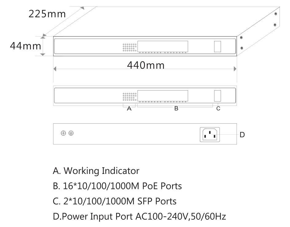 | Fixed Port | 16*10/100/1000Base-T PoE ports (Data /Power) 2*1000Base-X uplink SFP ports (Data) | |