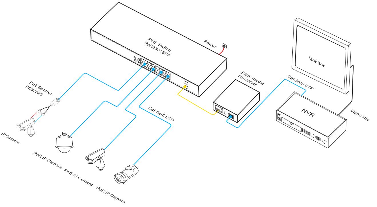 ONV-POE33016PF | Unmanaged PoE fiber switch with 16*10/100/1000M RJ45 ports and 2*1000M uplink SFP fiber slot ports, port 1-16 can support IEEE802.3af/at PoE standard. Support 1U/19 inch rack installation. | 250W |