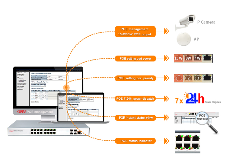 PoE network management, realize PoE port power allocation, priority setting, port power status viewing, time scheduling, etc.