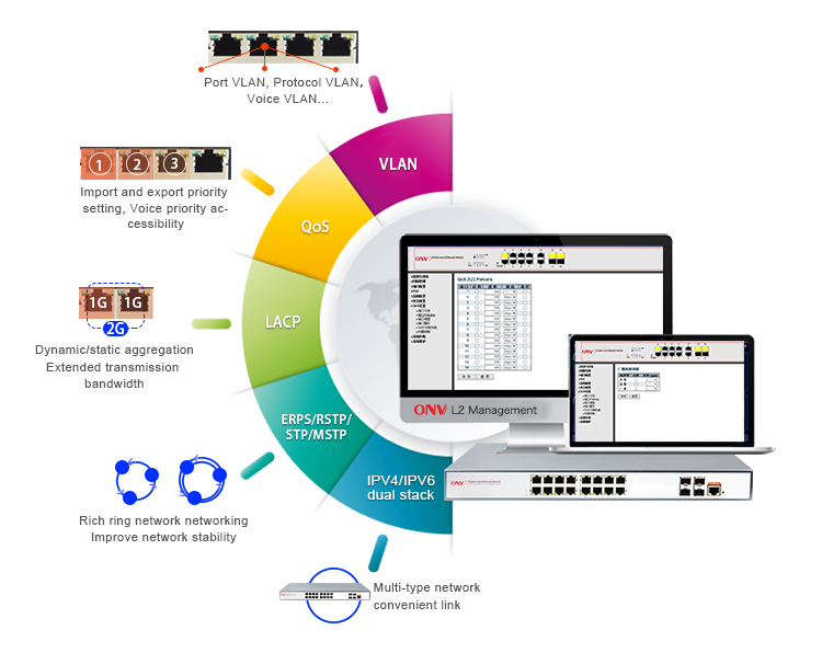 IEEE802.1Q VLAN, flexible VLAN division,Voice VLAN and QinQ configuration.