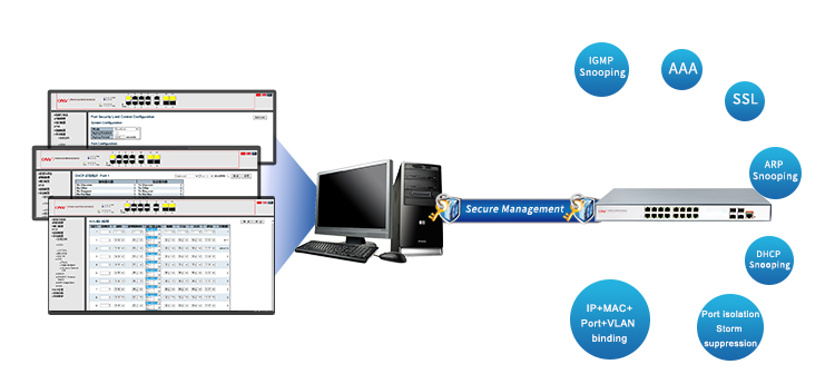 Security | User hierarchical management and password protection SSH 2.0,SSL,Port isolation,ARP message speed limit Broadcast storm control,Backup for host datum IEEE802.1X & MAC address authentication Mac black holes,IP source protection AAA & RADIUS,MAC learning limit ARP inspection,Anti-DoS attack IP-MAC-VLAN-Port binding | |