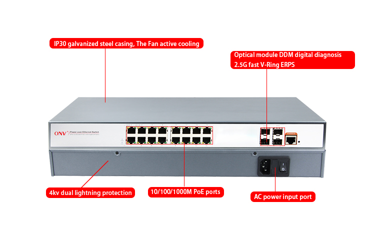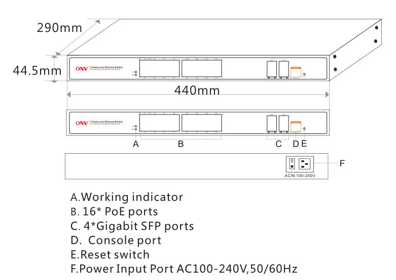ONV-POE33020PFM | L2+ managed PoE fiber switch with 16* 10/100/1000M RJ45 ports and 4*100/1000M SFP fiber slot ports, Port 1-16 can support IEEE802.3af/at PoE standard, Built-in 250W power supply. |