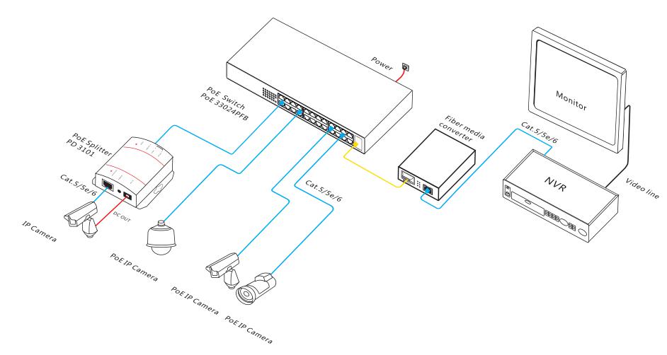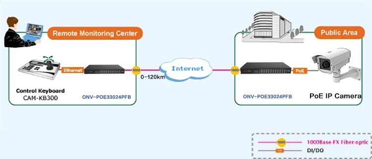 ONV-POE33024PFB | Unmanaged PoE fiber switch with 24*10/100/1000M RJ45 ports and 2*1000M uplink SFP fiber slot ports, port 1-24 can support IEEE802.3af/at PoE standard, Built-in 250W power supply. Support 1U/19 inch rack installation. |
