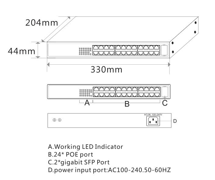 ◇ The user-friendly panel, it can show the device status through the LED indicator of PWR, PoE.