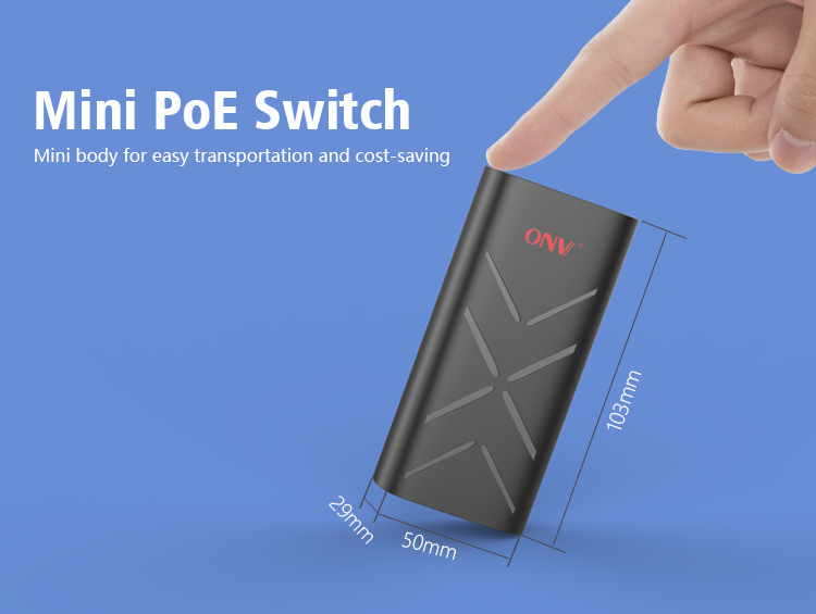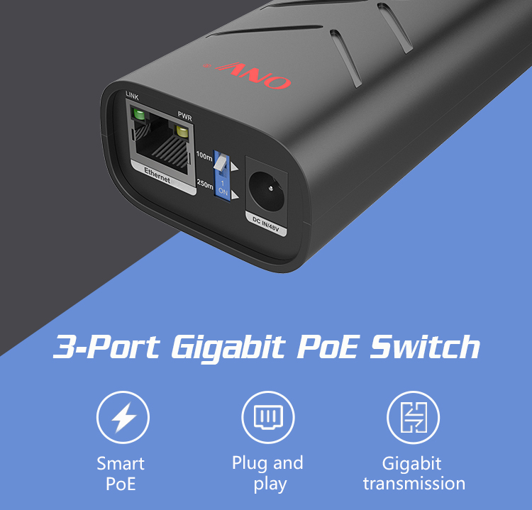 The ONV-POE33032PL is a gigabit unmanaged PoE switch independently developed by ONV. It has 3*10/100/1000M RJ45 ports. Port 1-2 can support IEEE802.3af/at standard PoE power supply, and single port PoE power reaches 30W. Adding a 10M/250-meter long-distance functional switch to the power supply port breaks through the twisted-pair transmission limit of 100 meters, effectively solving network transmission within 200 meters. As a PoE power supply device, it can automatically detect and recognize the power receiving equipment that meets the standard and supply power through the network cable. It can supply power to POE terminal equipment such as wireless AP, webcam, VoIP, visual intelligent building intercom through network cable, and meet the network environment that needs high-density PoE power supply. It is suitable for hotel, campus, factory dormitory and small and medium-sized enterprises.