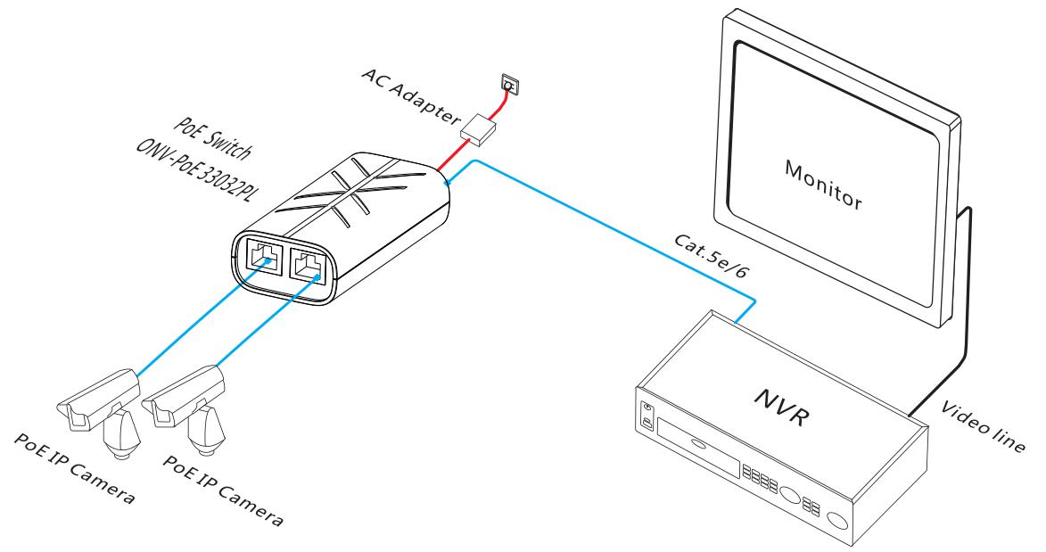 ONV-POE33032PL | Unmanaged PoE switch with 2*10/100/1000M PoE ports and 1*10/100/1000M uplink RJ45 port, Port 1–2 can support IEEE802.3af/at PoE standard. External power adapter. | 65W |