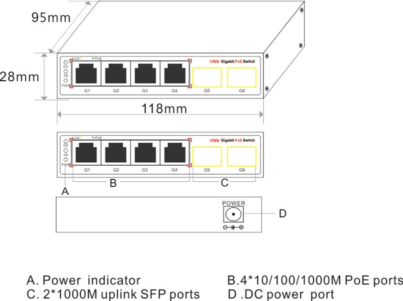 Fixed Port | 4*10/100/1000Base-T PoE ports (Data /Power) 2*1000Base-X uplink SFP slot ports (Data) | |