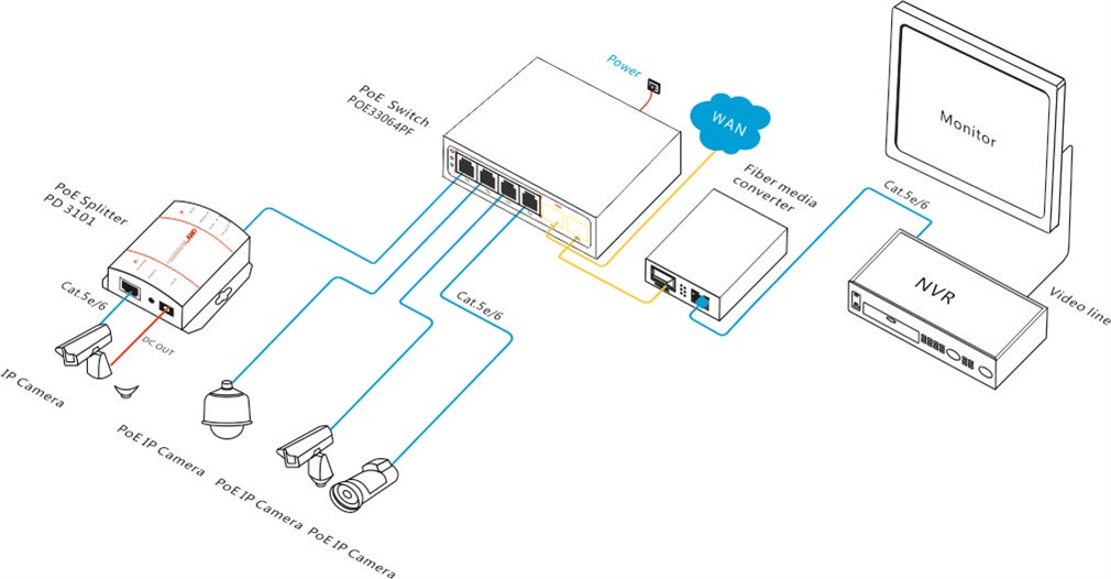 The ONV-POE33064PF is a full gigabit PoE fiber switch independently developed by ONV. It has 4*10/100/1000M RJ45 ports and 2*1000M SFP slot ports. Port 1-4 can support IEEE 802.3af/at standard PoE power supply. single port PoE power reaches 30W, and the maximum PoE output power is 65W (at-110W). As a PoE power supply device, it can automatically detect and recognize the power receiving equipment that meets the standard and supply power through the network cable. It can supply power to POE terminal equipment such as wireless AP, webcam, VoIP, visual intelligent building intercom through network cable, and meet the network environment that needs high-density PoE power supply. It is suitable for hotel, campus, park, attraction, supermarket, factory quarter and small and medium-sized enterprises to form a cost-effective network.