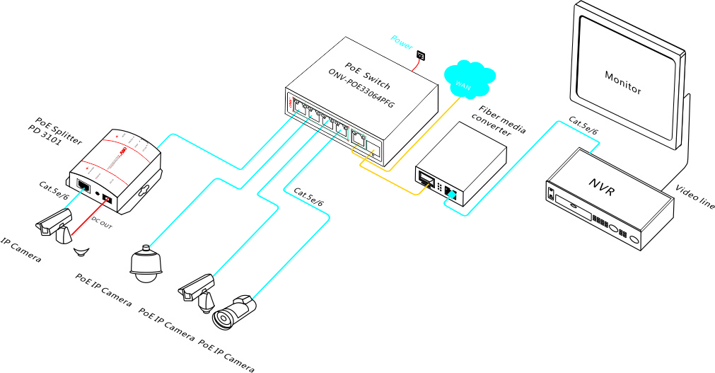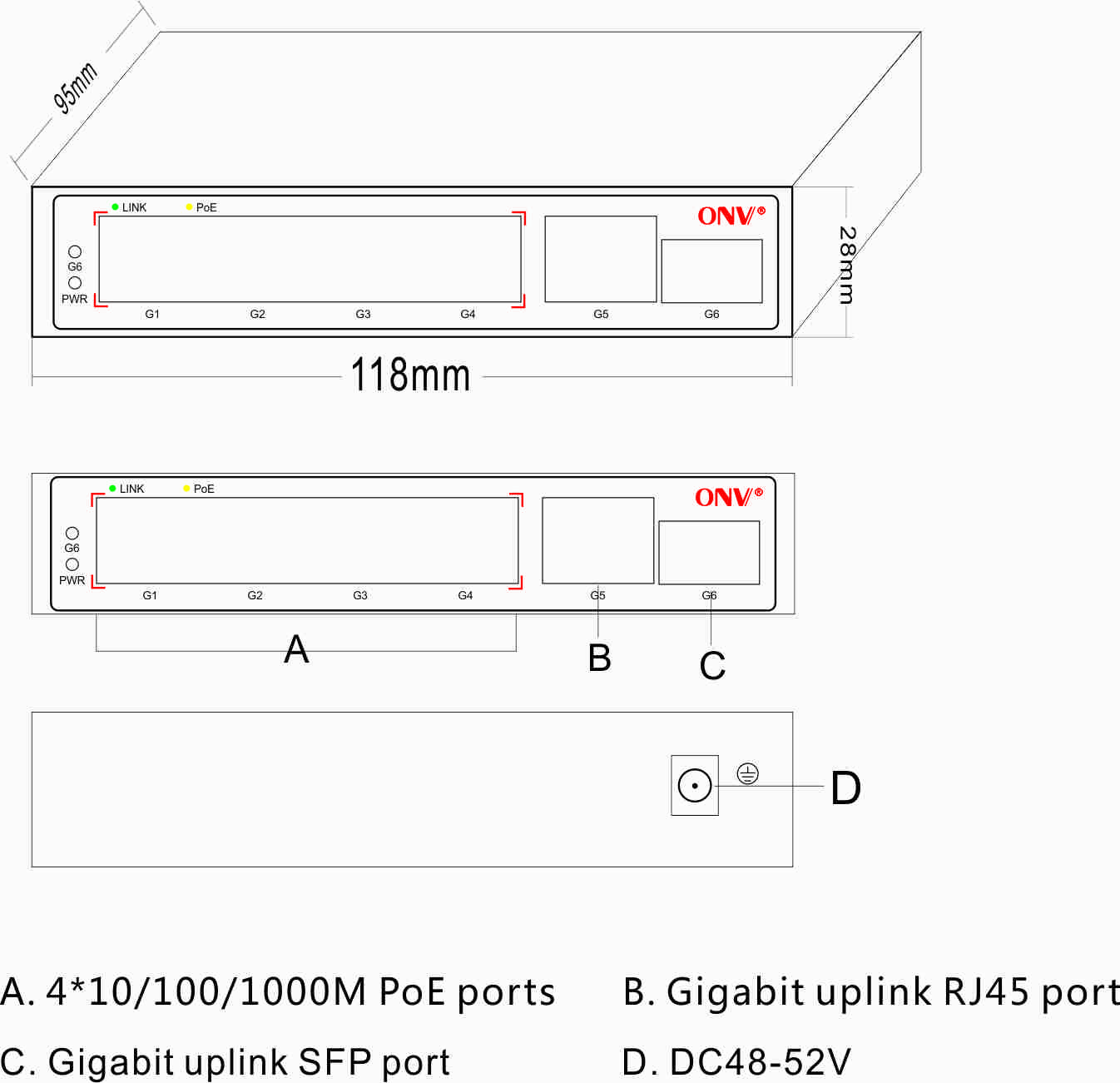 | ONV-POE33064PFG-at | Unmanaged PoE fiber switch with 5*10/100/1000M RJ45 ports and 1*1000M uplink SFP fiber slot port, port 1-4 can support IEEE802.3af/at PoE standard, External 110W power supply. |