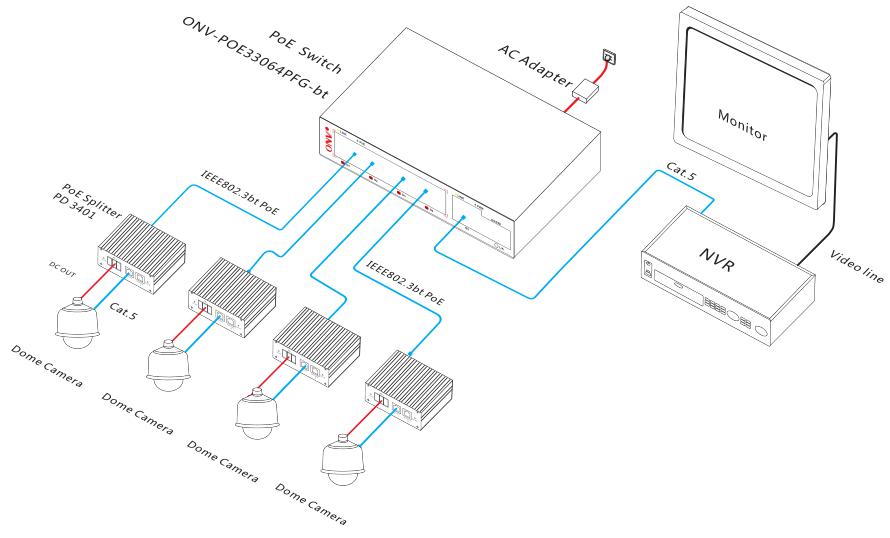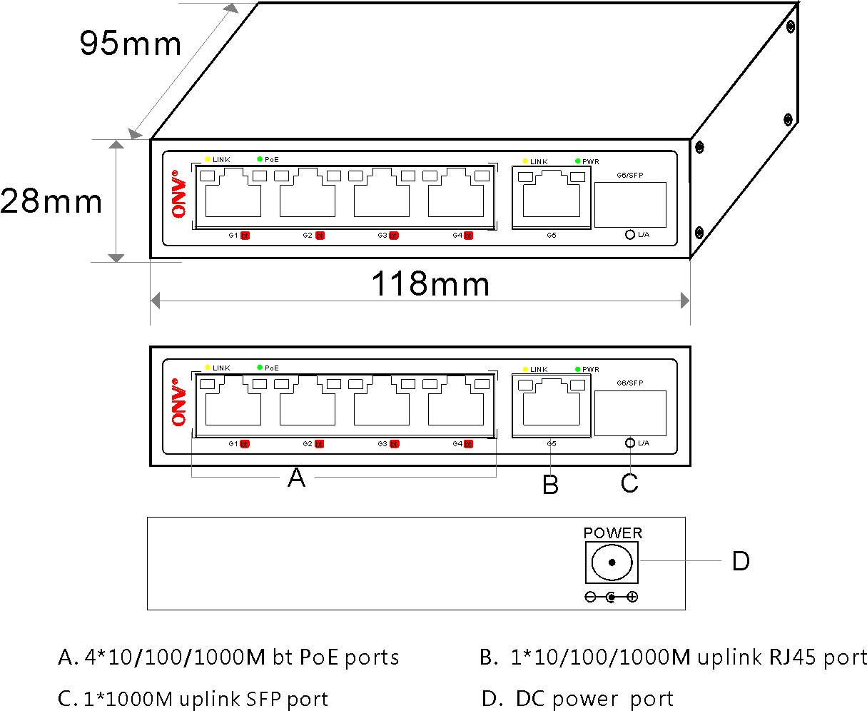 ONV-POE33064PF-bt | Unmanaged bt PoE switch with 4*10/100/1000M RJ45 ports and 2*1000M uplink SFP ports. Port 1-4 can support 71W super high power out and backward compatible with POE@IEEE802.3af/at. External power supply. | 250W |