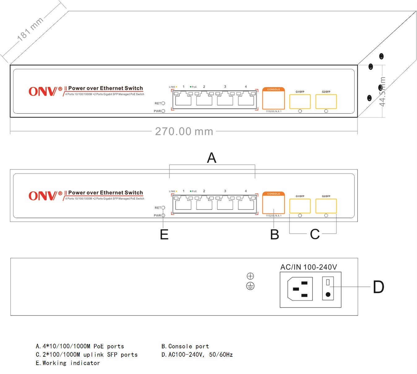 ONV-POE33064PFM | L2+ managed PoE fiber switch with 4* 10/100/1000M RJ45 ports and 2*100/1000M SFP fiber slot ports, Port 1-4 can support IEEE802.3af/at PoE standard, Built-in 65W power supply. Support 1U/19 inch rack installation. |