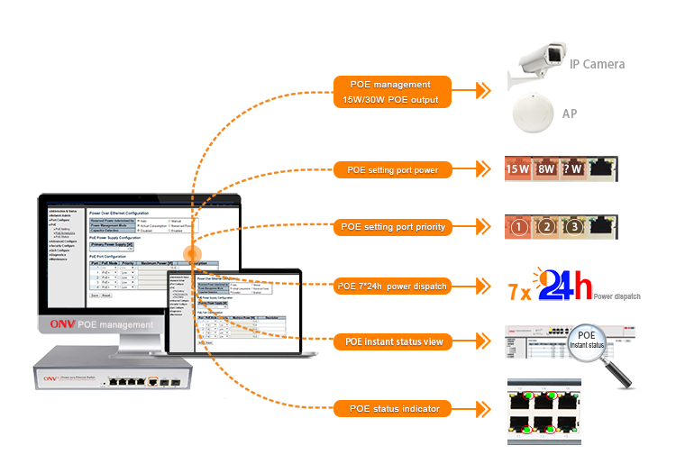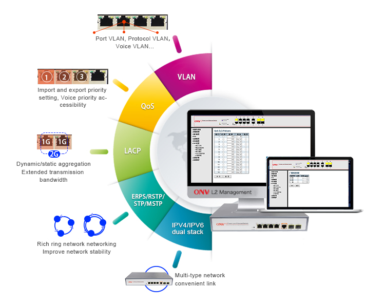 The ONV-POE33064PFM has L2+ full network management function, supports IPV4/IPV6 management, static route full line rate forwarding, security protection mechanism, complete ACL/QoS policy and rich VLAN functions, and is easy to manage and maintain. Supports multiple network redundancy protocols STP/RSTP/MSTP (<50ms) and (ITU-T G.8032) ERPS to improve link backup and network reliability. When one-way network fails, communication can be quickly restored to ensure important Uninterrupted communication for applications. According to the actual application requirements, you can configure multiple application services such as PoE power management, port traffic control, VLAN division, and SNMP through the Web network management mode.