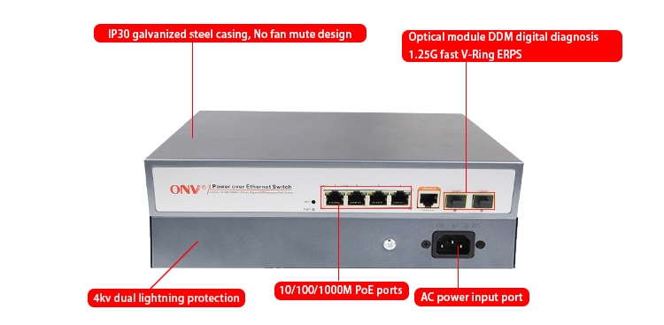The ONV-POE33064PFM is a L2+managed PoE fiber switch independently developed by ONV. It has 4*10/100/1000Base-T RJ45 ports and 2*100/1000Base-X SFP fiber slot ports . Port 1-4 can support IEEE 802.3af/at standard PoE power supply. single port PoE power reaches 30W, and the maximum PoE output power is 65W(at-130W). As a PoE power supply device, it can automatically detect and recognize the power receiving equipment that meets the standard and supply power through the network cable. It can supply power to POE terminal equipment such as wireless AP, webcam, VoIP phone, building visual access control intercom, etc. through a network cable to meet the network environment that needs high-density PoE power supply. It is suitable for hotels, campuses, parks, shopping malls, scenic spots, hospitals,, factory dormitory and small and medium-sized enterprise.