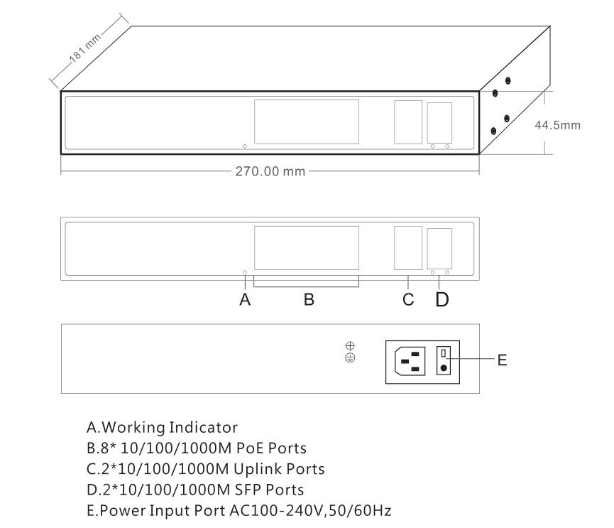 Fixed Port | 8*10/100/1000Base-T PoE ports (Data /Power) 2*10/100/1000Base-T uplink RJ45 ports (Data) 2*1000Base-X uplink SFP ports (Data) | |