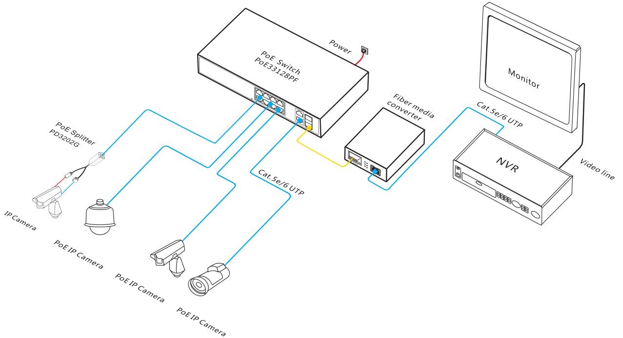 The ONV-POE33128PF is a full gigabit unmanaged PoE fiber switch independently developed by ONV. It has 10*10/100/1000M RJ45 ports and 2*1000M SFP port slots, Port 1-8 can support IEEE802.3af/at PoE standard, single port PoE power up to 30W, Total power is 130W(at-250W). As a PoE power supply device, it can automatically detect and recognize the power receiving equipment that meets the standard and supply power through the network cable. it can automatically detect and identify the the electrical equipment that meets the standard and supply power to it through the network cable, devices including wireless AP, IP camera, IP telephone and other PoE terminal equipment etc. In addition, it is suitable for networking system of hotel, campus, dormitory and small&medium enterprise etc.