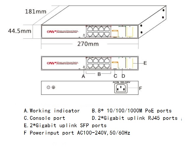 Fixed Port | 8*10/100/1000Base-T PoE ports (Data/Power) 2*10/100/1000Base-T uplink RJ45 ports (Data) 2*100/1000Base-X uplink SFP ports (Data) 1*Console RS232 port (115200,N,8,1) | |