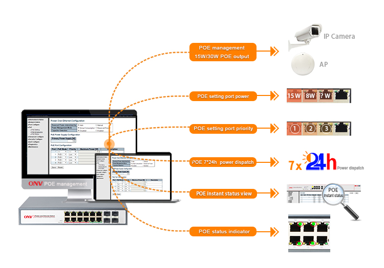 | Management | One-key recovery Cable Diagnose,LLDP Web Management (HTTPS) NTP,System work log,Ping Test CPU instant utilization status view Console/AUX Modem/Telnet/SSH2.0 CLI Download & Management on FTP, TFTP, Xmodem, SFTP,SNMP V1/V2C/V3 ONV NMS – smart network management system platform(LLDP+SNMP) | |